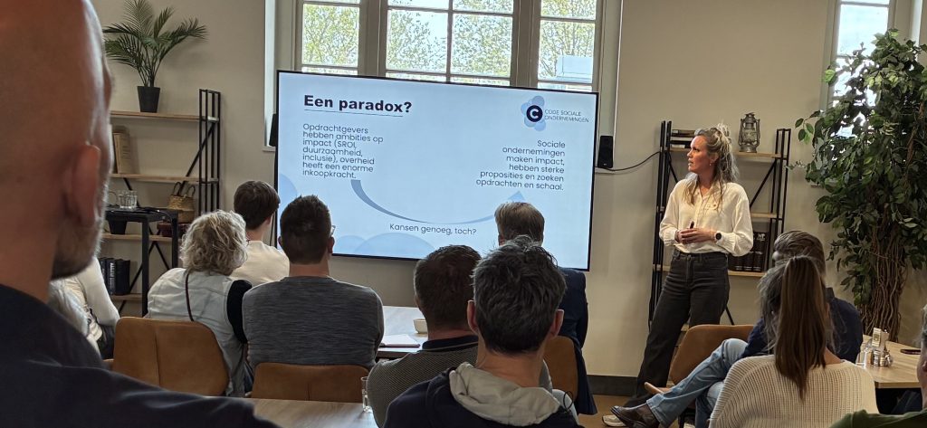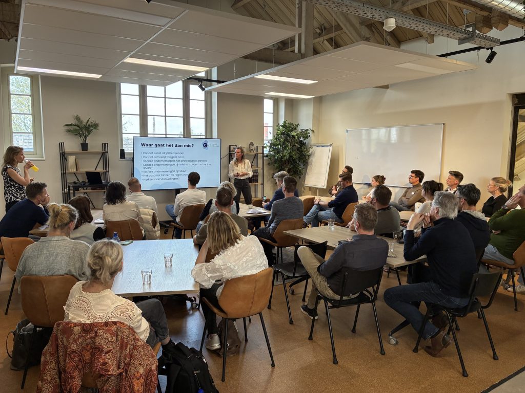 Na zijn presentatie voor de hele groep mocht Matthias blijven staan voor zijn workshop ‘Commercieel met geweten’. Het overige deel van de groep verdeelde zich over de workshop van Marijt Regts (Code Sociale Ondernemingen) over het zichtbaar maken van je impact en Hendrik De Vries (Copper8) over impact maken met je inkoop. Uiteraard hebben we de middag met zijn allen afgesloten met een rondje op de impactmarkt onder het genot van een hapje en een drankje.